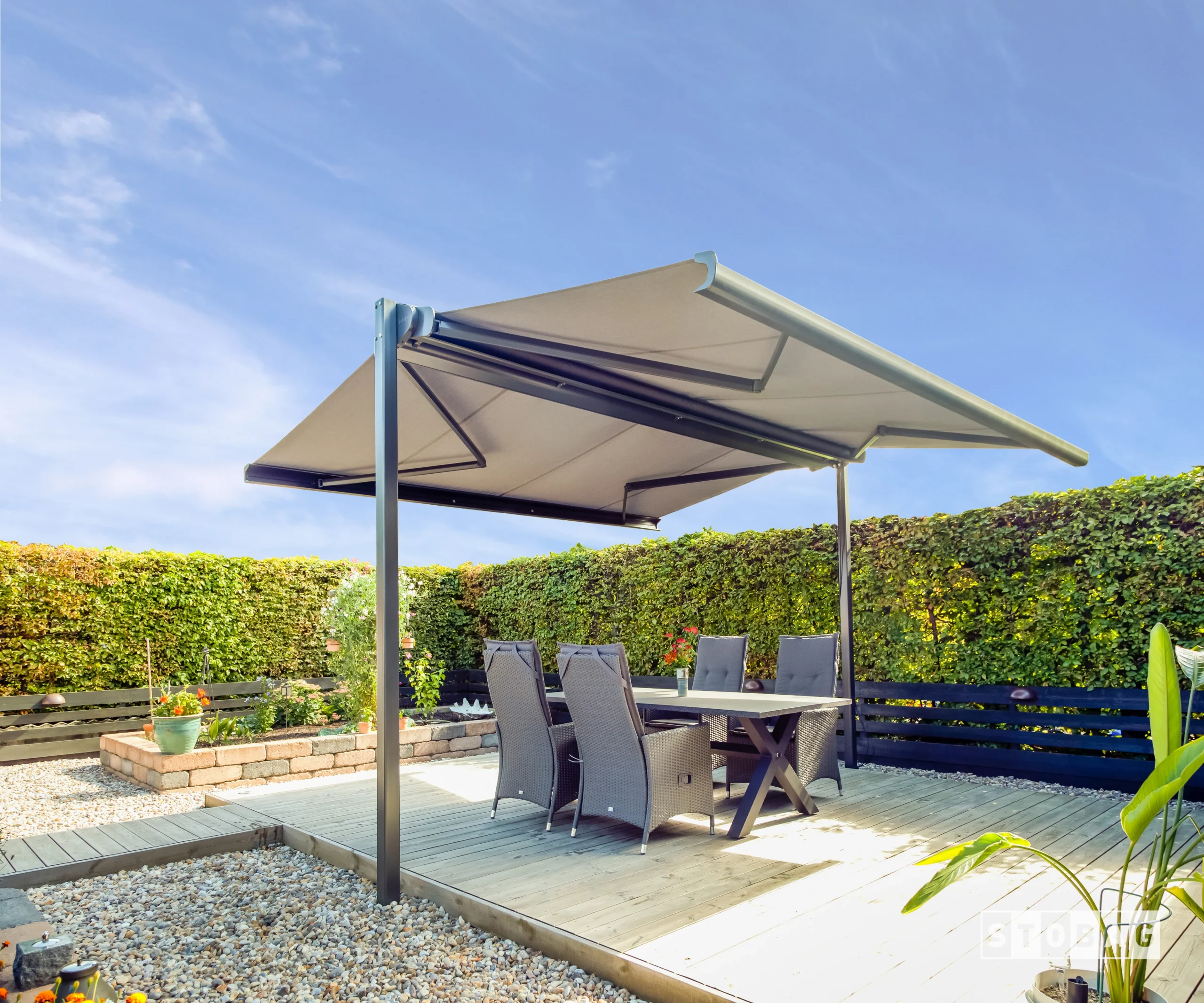 Erweitern Sie Ihren Lebensraum ins Freie mit unseren innovativen freistehenden Beschattungssystemen. Perfekt für Gärten, Terrassen und gewerbliche Aussenbereiche bieten diese Systeme nicht nur Schutz vor der Sonne, sondern auch eine flexible Gestaltungsmöglichkeit für jeden Standort.